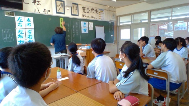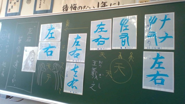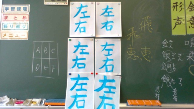 小グループによるリレー書道で「右」と「左」の漢字を書き、互いの作品を鑑賞します。