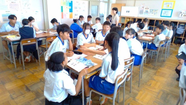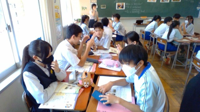 生徒たちは、自分の考えを英語で伝えるにはどうすればいいか、考えながら話合っていました。