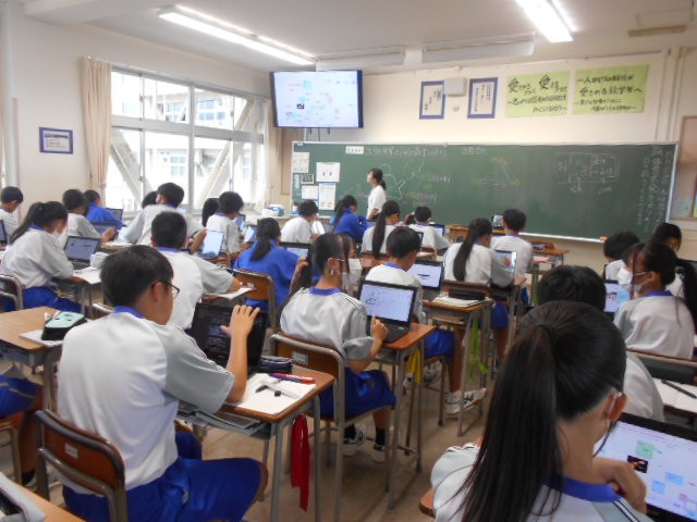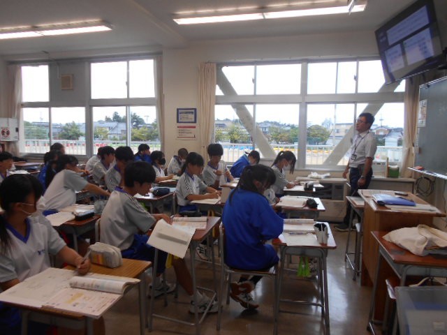 (写真 中:1年2組 数学「一次方程式の利用」)