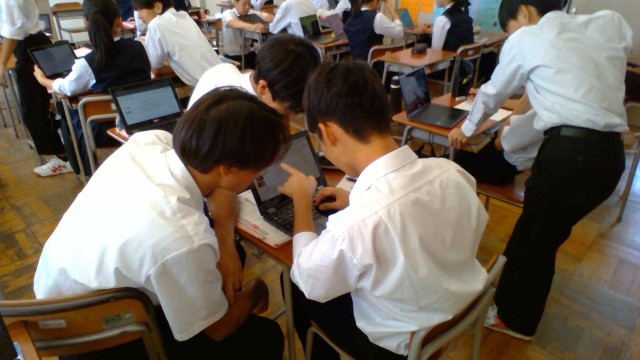 発表原稿を読んでいるところをクロムブックで撮影し、自己評価をしたり、友だち同士でアドバイスをし合ったりしています。