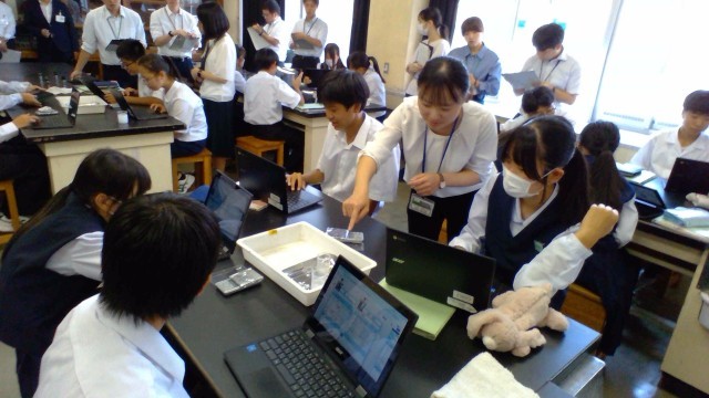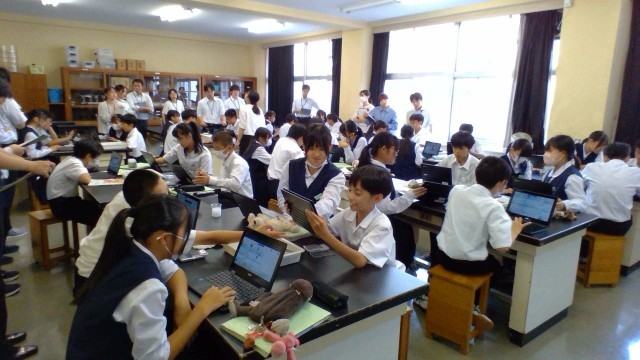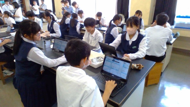 1年・理科・物質の状態変化 公開日 2025/10/07 更新日 2025/10/07 1学年 10月7日(火) 5限 1年2組で理科の研究授業が行われ、市内から多くの先生方が来校されました。 授業のテーマは「物質の状態変化」です。同じ物質の状態が固体から液体に変わることで、体積や質量にどのような変化が現れるかを観察します。生徒たちは、物質の変化を言葉でまとめるだけでなく、クロムブックで実験の様子を撮影し、視覚的にもわかりやすい実験レポートを作成していました。