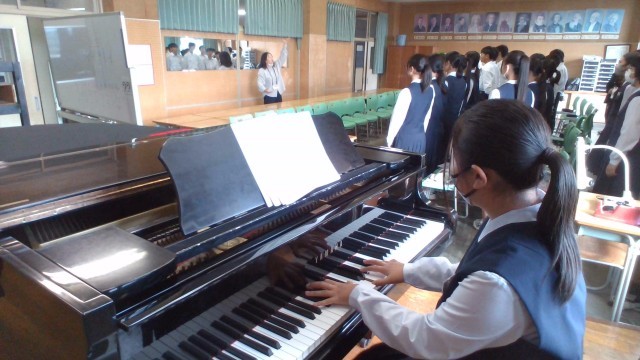 1年・音楽・合唱 公開日 2025/10/21 更新日 2025/10/21 1学年 10月21日(火) 6限 1年3組の音楽の授業です。合唱コンクールの曲を練習していました。徐々に声が出るようになり、これからが楽しみです。