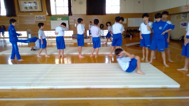 マット運動で、開脚後転や側方倒立回転(側転)などの練習しています。