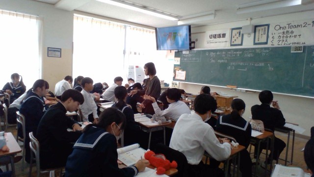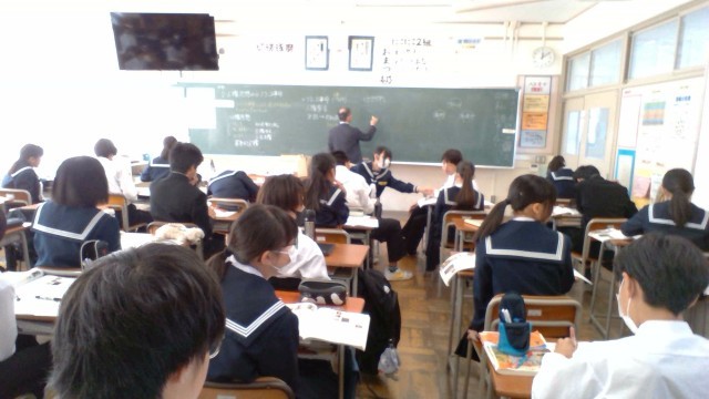 2年・授業風景 公開日 2025/10/29 更新日 2025/10/29 2学年 10月29日(水) 4限 2年生の授業の様子です。和気あいあいとした雰囲気で学習に臨んでいます。 (写真 上:2年1組 英語「What design is good for everyone?」)(写真 中:2年2組 社会「人権思想からフランス革命」)(写真 下:2年5組 国語「用言の活用」)