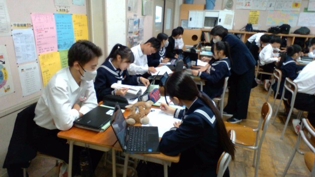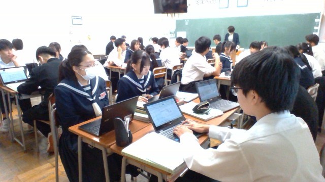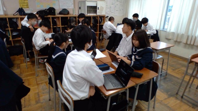 3年・理科・物体の運動と力 公開日 2025/10/31 更新日 2025/10/31 3学年 10月31日(金) 4限 3年4組の理科の授業です。質量の異なる物質を斜面で転がし、その動きを観察する実験のまとめをしています。生徒たちは、それぞれの物質の動きを表やグラフにまとめ、どのように見せればわかりやすい発表になるかを話合っていました。