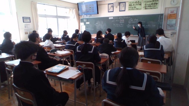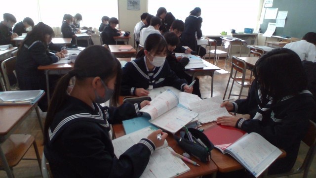 1年生は、期末考査も近く、友達と教え合いながら学習しています。
