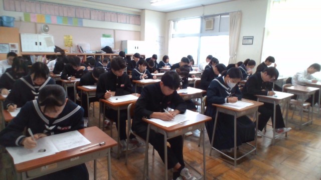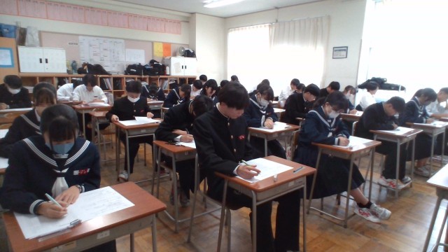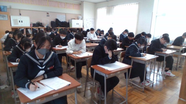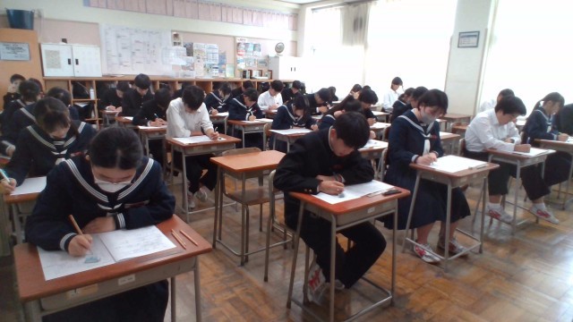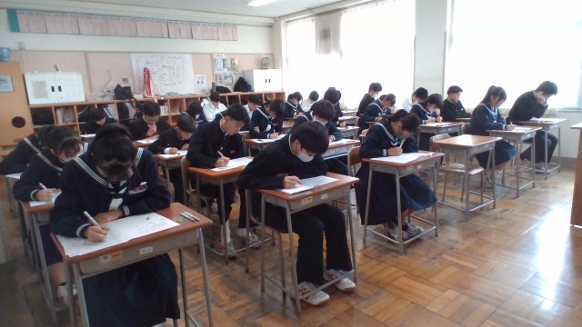 3年・2学期末考査・2日目 公開日 2025/11/26 更新日 2025/11/26 3学年 11月26日(水) 3限 3年生の2日目は、1限:技術家庭、2限:理科、3限:音楽のテストが行われました。音楽のテストでは、合唱コンクールで歌った曲が出題されていました。(写真 上から3年1組~3年5組) +2