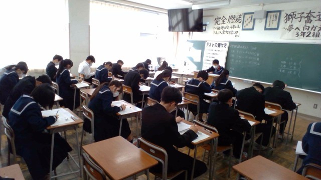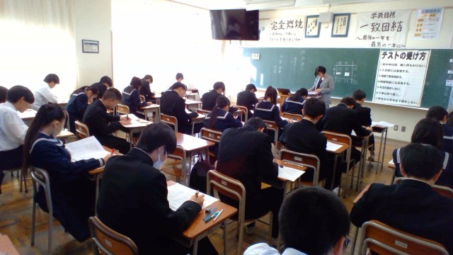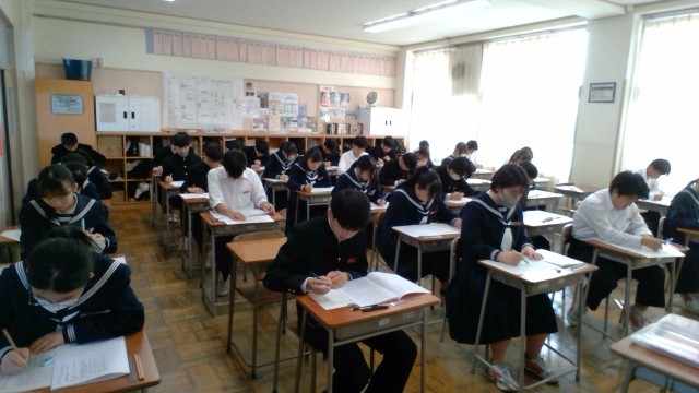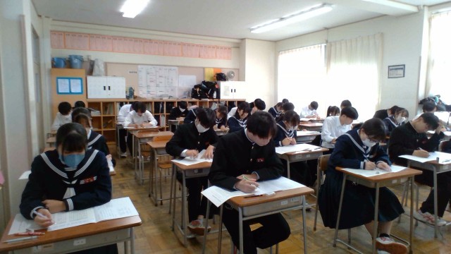 3年・2学期末考査・3日目 公開日 2025/11/27 更新日 2025/11/27 3学年 11月27日(木) 1限 2学期末考査の最終日です。3年生は国語の試験を受けています。論説、古典(和歌)、文法に作文と、幅広い分野から出題されています。作文問題では、最後まであきらめずに文章を推敲する姿がありました。 (写真 上から3年1組~3年5組) +2