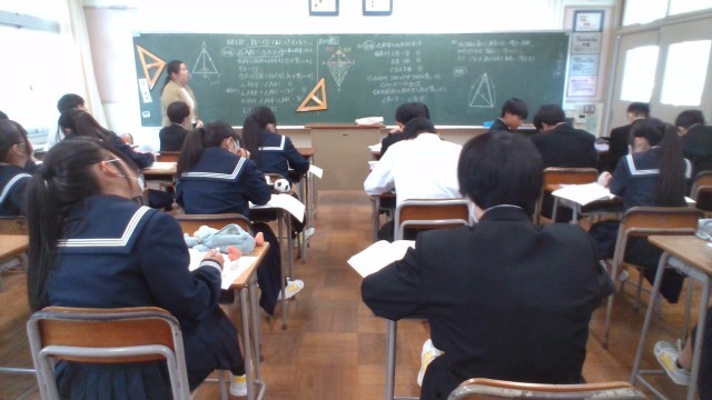 (写真 1、2枚目:2年1組 数学・少人数「三角形と四角形」)