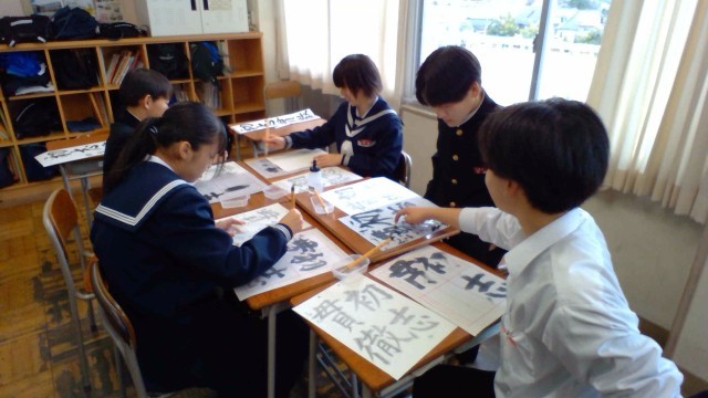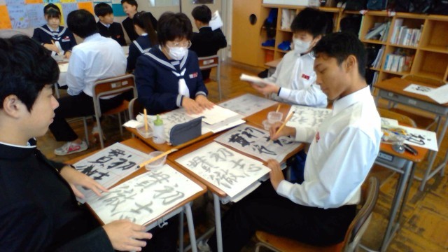 3年・国語・書初大会に向けて 公開日 2025/12/15 更新日 2025/12/15 3学年 12月15日(月) 3限 3年2組の国語では、書初の練習をしています。3年生の題は「初志貫徹」です。水で書ける紙を使い、汚れを気にせず何度も繰り返し練習しています。行書体で筆の運びが難しいですが、生徒たちは筆の動きを確認しながら練習を重ねていました。