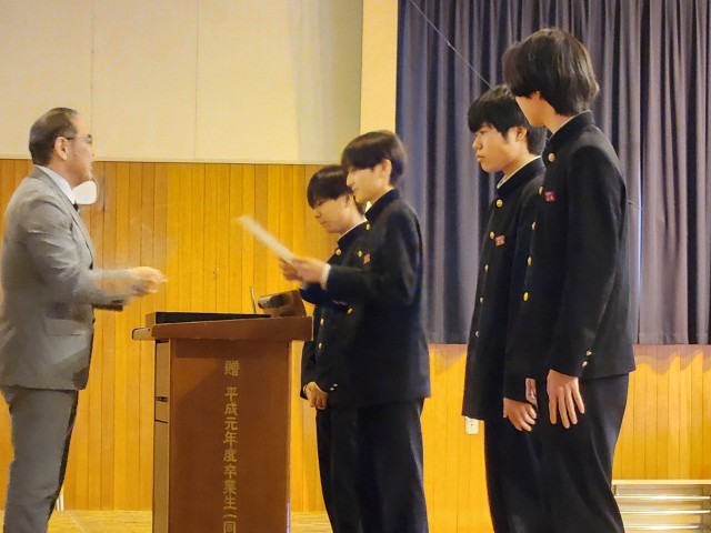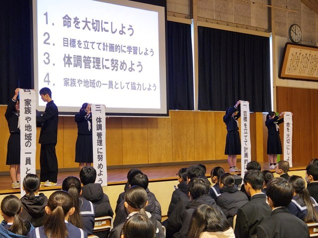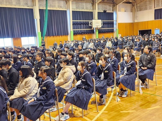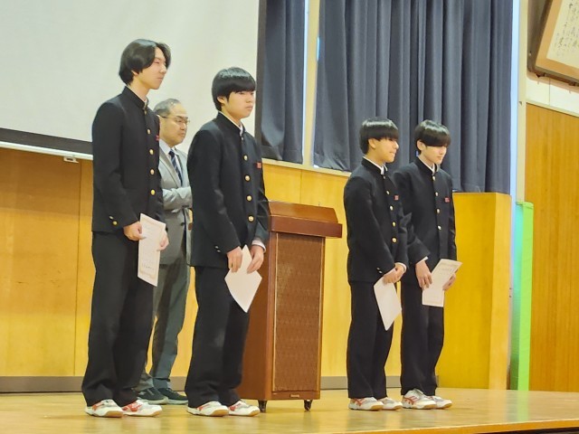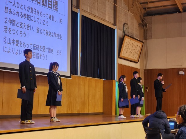 生徒集会 公開日 2025/12/23 更新日 2025/12/23 生徒会活動 12月23日(火) 4限 執行部・専門委員会より2学期の活動報告と今後の課題について発表がありました。また、冬休みの過ごし方を分かりやすく大きな文字で確認したり、生徒会メンバーによる劇「あの火、あの時、あの場所で」を見て、改めて軽率な行動が重大事件へと発展してしまう怖さを学んだりすることができました。集会の後半では山室の地域に貢献した生徒に送られる「山中愛賞」の受賞報告が行われました。 +4