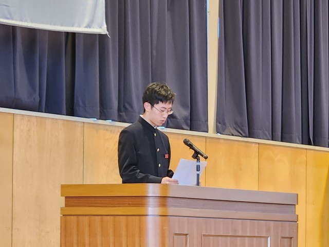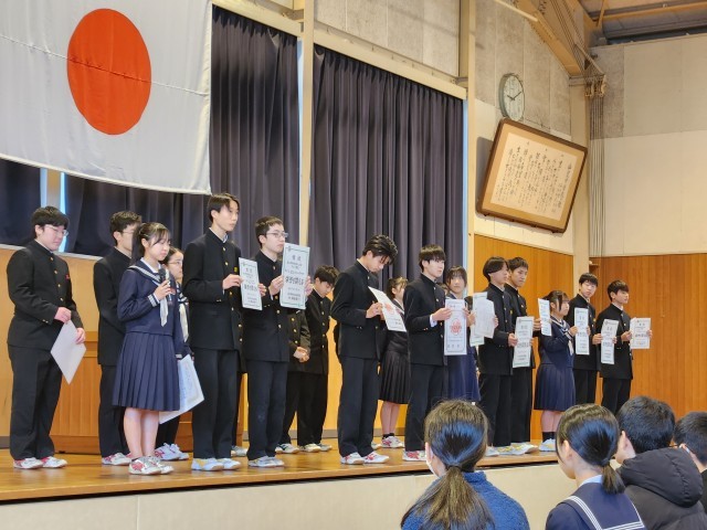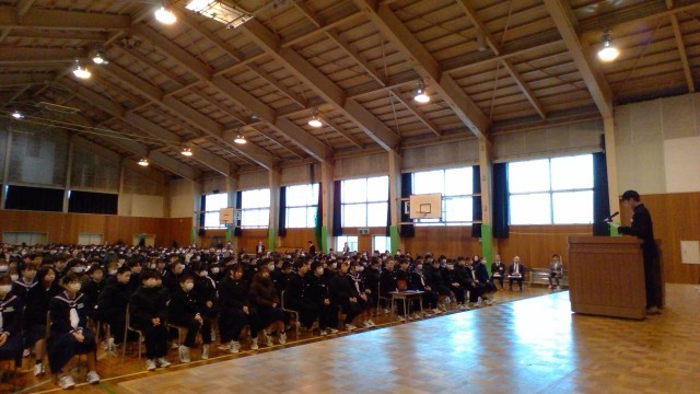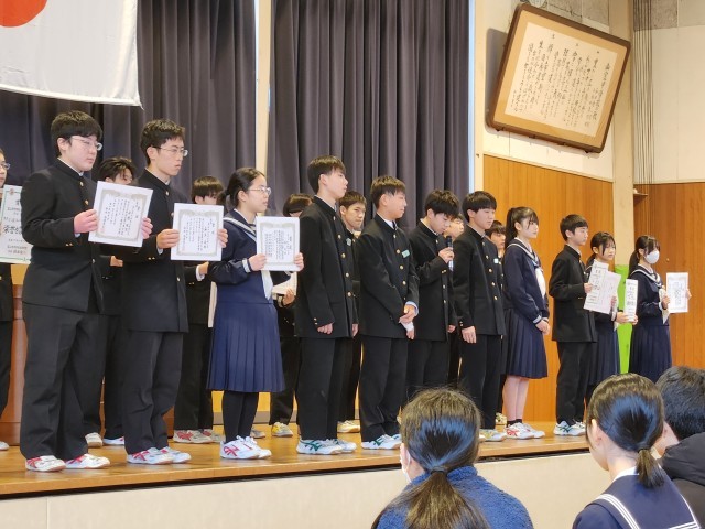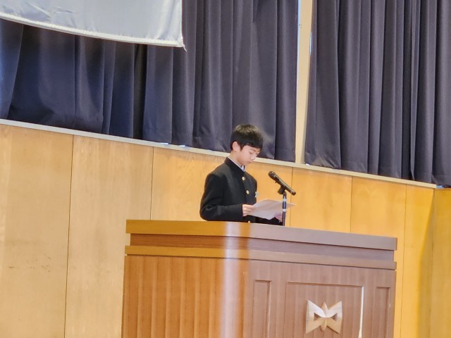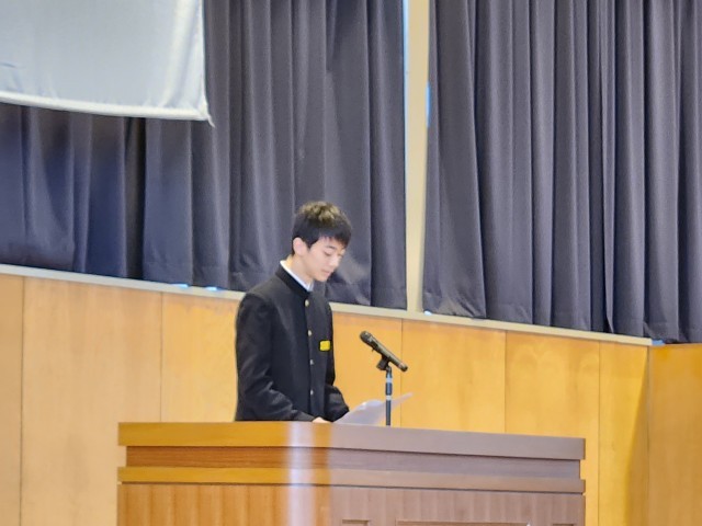 受賞報告・意見発表 公開日 2025/12/24 更新日 2025/12/24 山室中学校のページ 12月24日(水) 9:00 体育館にて、受賞報告と代表生徒による意見発表がありました。2学期、部活動やクラブチーム等で活躍した生徒がその成果を報告し、これからの抱負を語りました。意見発表では各学年の代表生徒が、学習や部活動、生徒会活動など2学期に取り組んできたことについて、力強い言葉で発表していました。 +3