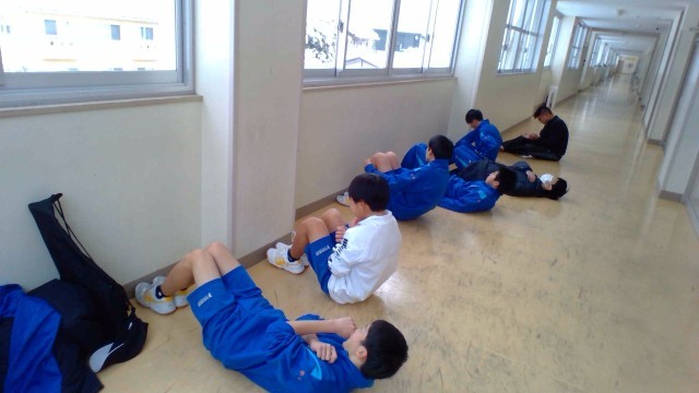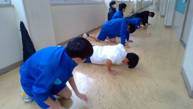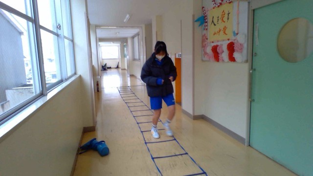 1月6日(火)の部活動・その3 公開日 2026/01/06 更新日 2026/01/06 部活動 1月6日(火) 9:30 ソフトテニス部の活動です。雪でテニスコートが使えないため、廊下で筋トレなど基礎体力をつける練習を行っています。
