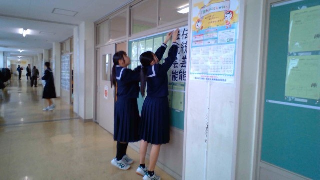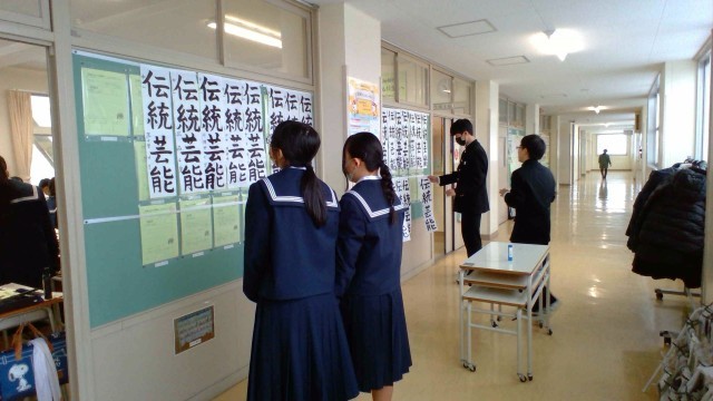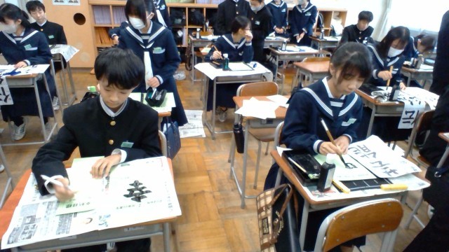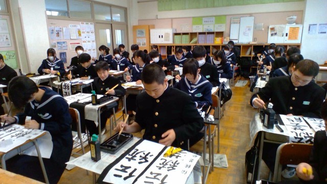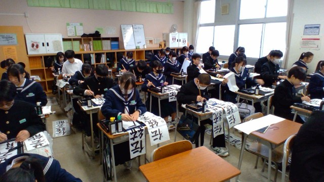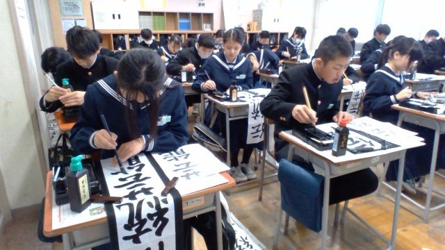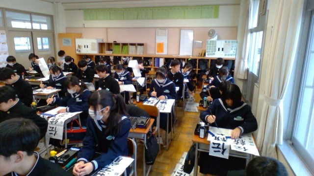 1年・書き初め大会 公開日 2026/01/08 更新日 2026/01/08 1学年 1月8日(木) 2限 1年生の書き初め大会です。題は「伝統芸能」です。楷書体で、一画一画を丁寧に区切って書きます。 また、書初の後は、同じく毛筆を使って「今年の漢字」をしたためました。生徒たちは「学」「努」等、思い思いの漢字を選び、今年の抱負にしていました。 +7