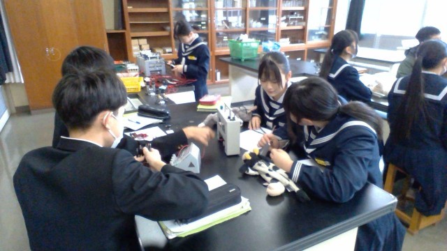 直列つなぎと並列つなぎでどのような違いがみられるか、測定する箇所を変えるとどうかなど、声をかけ合い協力しながら測定していました。