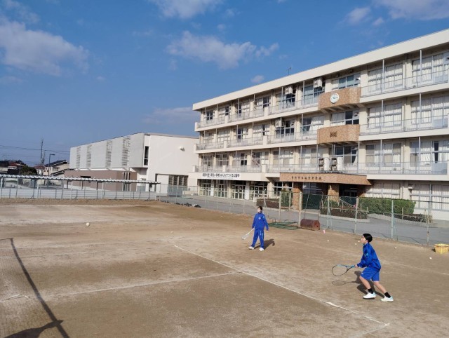 1月17日(土)の部活動・その1 公開日 2026/01/17 更新日 2026/01/17 部活動 1月17日(土) 9:00 少し肌寒いですが、外でソフトテニス部活動中です。1月に、テニスコートでボールを打ち、練習できることに感謝です。