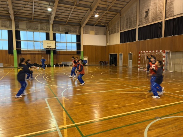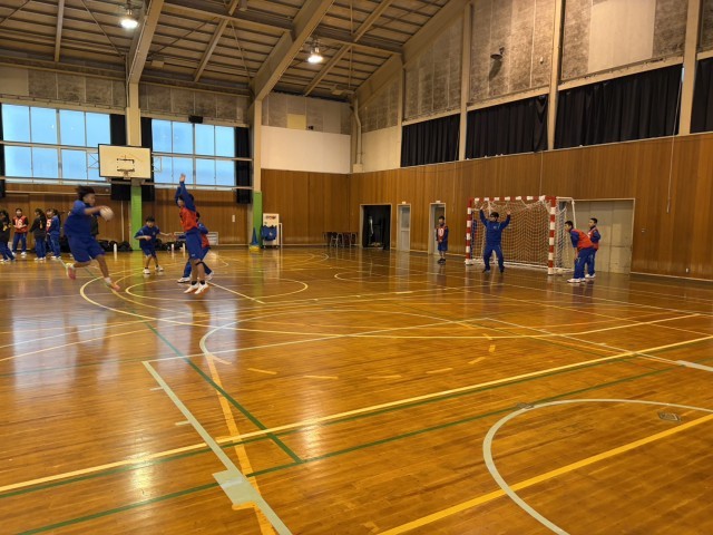 外は雪が降っていますが、体育館の中ではハンドボール部が活動しています。