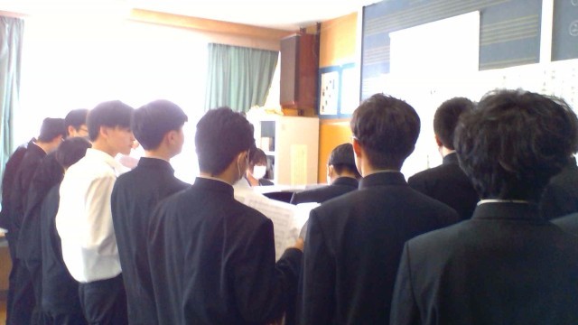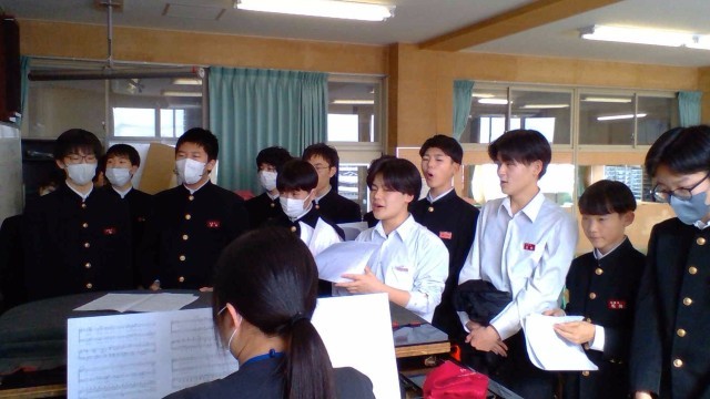 3年・音楽・合唱「空は今」「群青」 公開日 2026/01/28 更新日 2026/01/28 3学年 1月28日(水) 5限 3年2組の音楽の授業です。全体合唱「空は今」と、卒業生による合唱「群青」のパート練習をしています。 「あの日見た夕日 あの日見た花火 いつでも君がいたね 当たり前が幸せと知った」(「群青」歌詞より) クラスの仲間と一緒に練習できる日も、残り少なくなってきました。中学校生活の思い出を噛みしめながら、一音一音を大切に歌っています。 +1