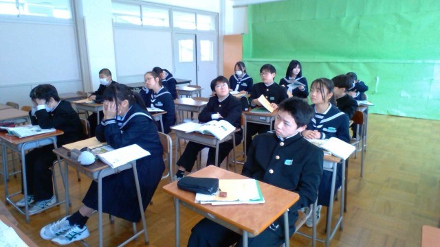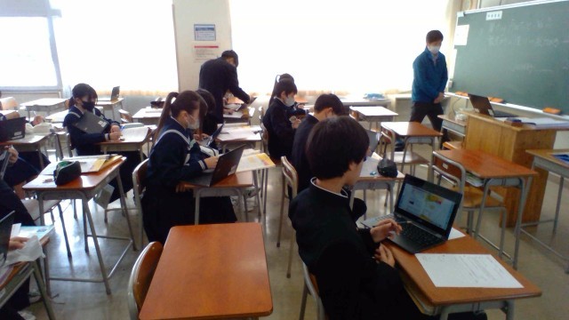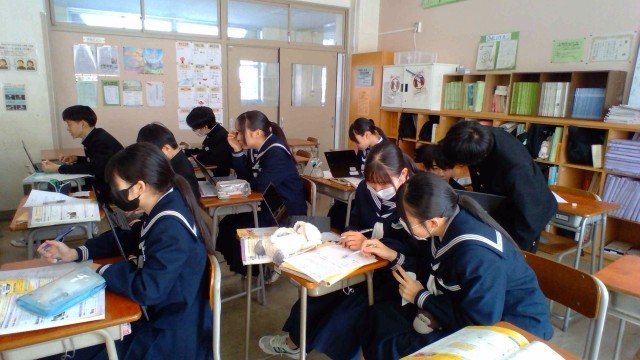 1年・英語・be動詞の過去形/旅先からの便り 公開日 2026/02/03 更新日 2026/02/03 1学年 2月3日(火) 3限 1年2組の英語の授業(少人数)です。これまでに学んだことをビンゴゲームの形式で復習したり、想像上の旅先から友人に送る手紙を書いたりしています。わからないところや深く知りたいところはタブレットで調べ、意欲的に学習しています。 +1