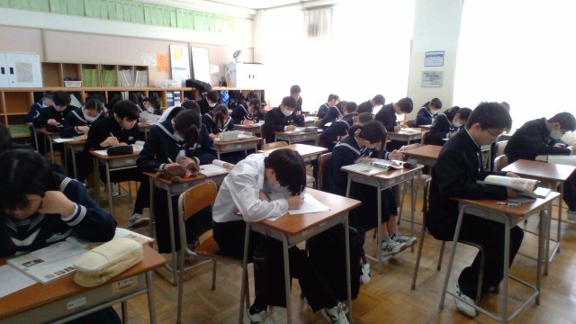 1年・授業風景 公開日 2026/02/10 更新日 2026/02/10 1学年 2月10日(火) 2限 1年生の授業の様子です。学年末考査に向けて、これまでの復習に取り組んでいる教科もあります。どのクラスも集中して課題に向かっていました。 (写真 上:1年1組 数学「立体の展開図」)(写真 中:1年3組 国語「充実した話合いのために」)(写真 下:1年5組 社会「鎌倉時代」)