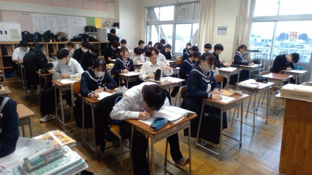 3年・授業風景 公開日 2026/02/17 更新日 2026/02/16 3学年 2月16日(月) 1限 新しい一週間が始まりました。今週は、3年生にとって中学校生活最後の定期考査があります。どのクラスも集中して復習や練習問題に取り組んでいます。 (写真 上:3年1組 理科)(写真 中:3年3組 社会)(写真 下:3年4組 英語)