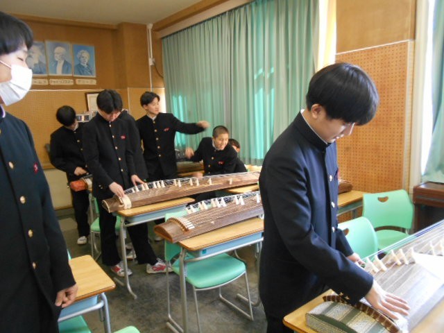 (写真 上:3年2組 音楽「箏-正しい奏法を身につけ『さくらさくら』を演奏しよう」)