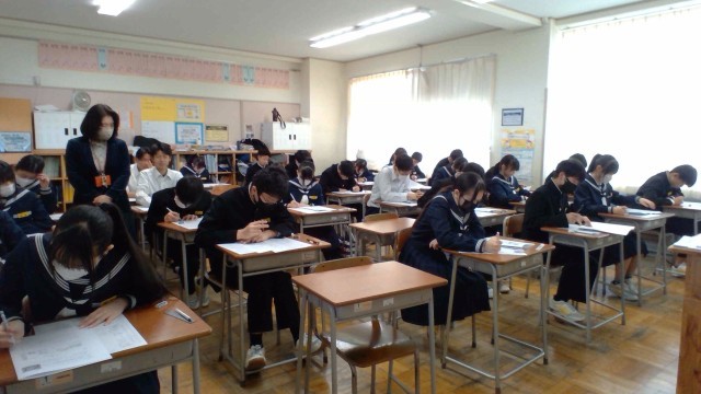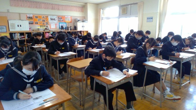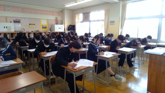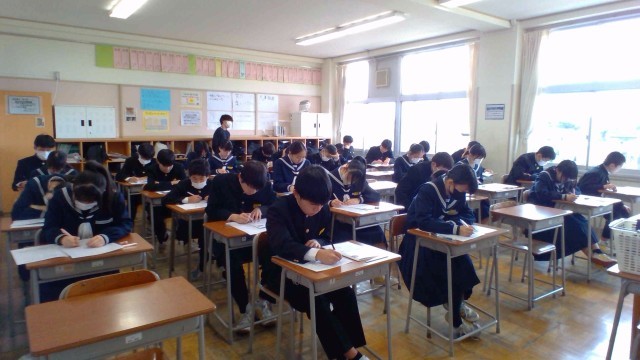 2年・学年末考査(2日目) 公開日 2026/02/19 更新日 2026/02/19 2学年 2月19日(木) 1限 学年末考査、二日目です。2年生は、社会の試験を受けています。日本の地理や、近現代の歴史など幅広い分野から出題されています。最後まで集中して問題に向き合っています。(写真 上から2年1組~2年5組) +2