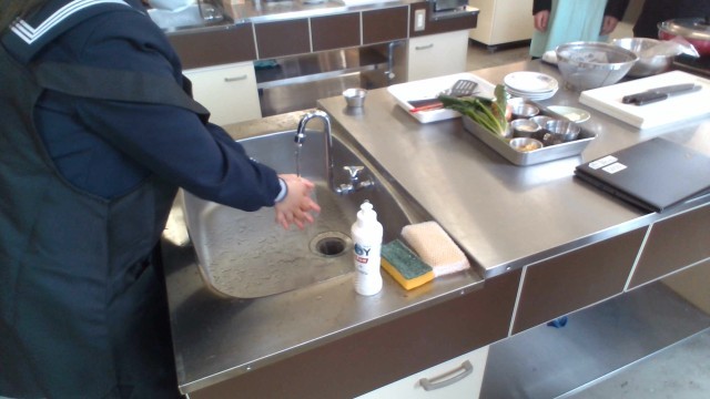 今週は毎日、1年生の調理実習があります。今日は、1年2組です。調理の前にエプロンを着たり、手洗いをしています。