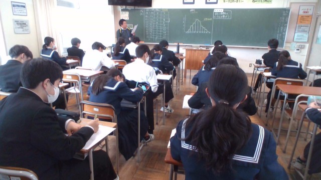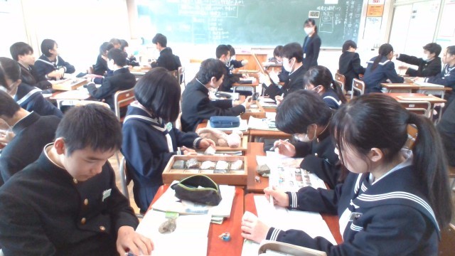 1年・授業風景 公開日 2026/03/04 更新日 2026/03/04 1学年 3月4日(水) 4限 1年生は、問題演習をしたり、実物を見ながらノートにまとめたりと落ち着いて授業に臨んでいます。(写真 上:1年3組 英語「Unit10」)(写真 中:1年4組 理科「地層をつくる岩石」)(写真 下:1年5組 数学「相対度数」)