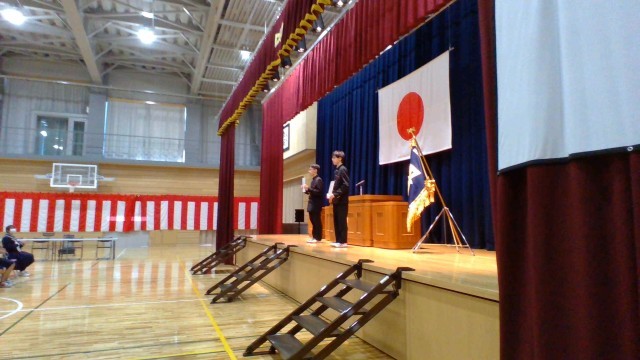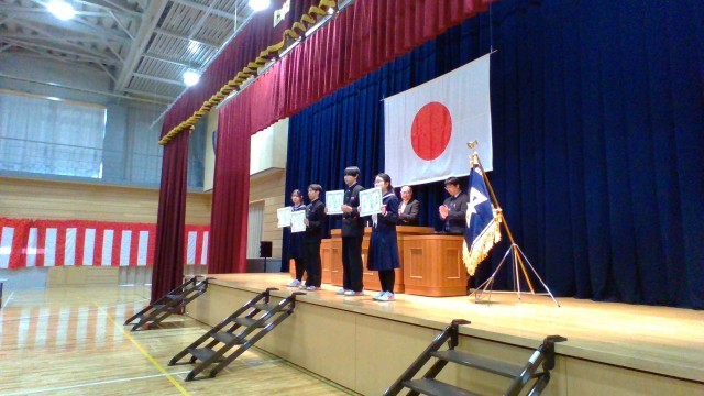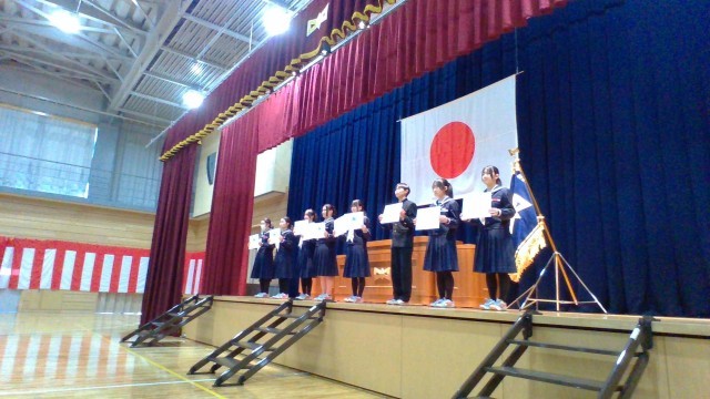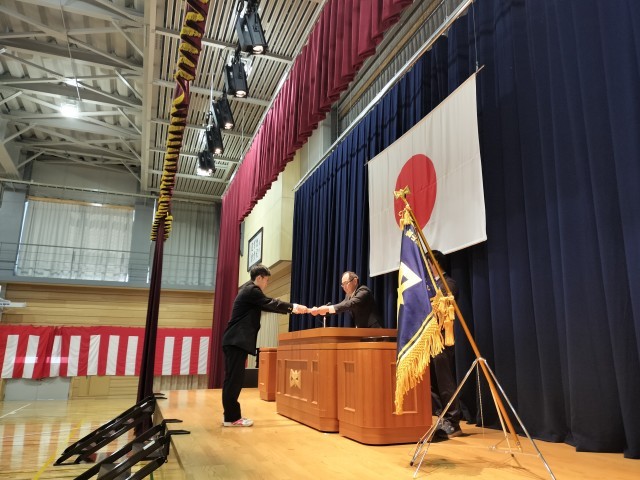 中学校の全ての学習を修めた証として、代表生徒が修了証を受け取りました。