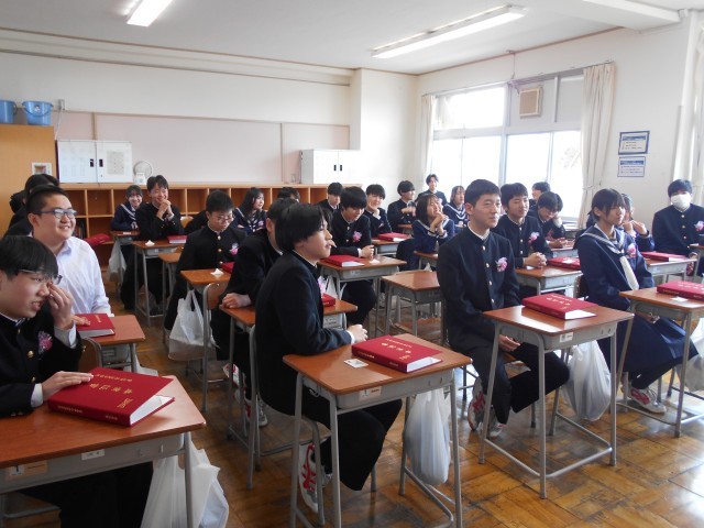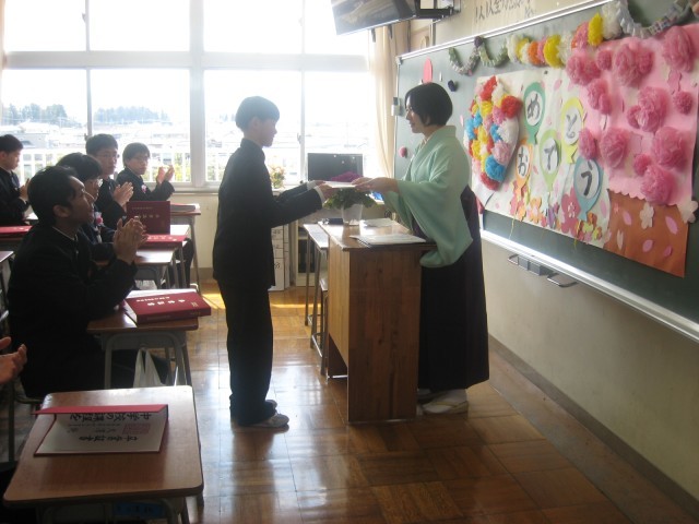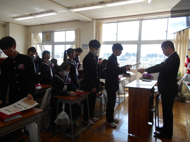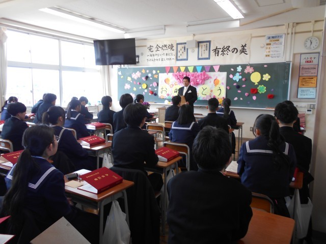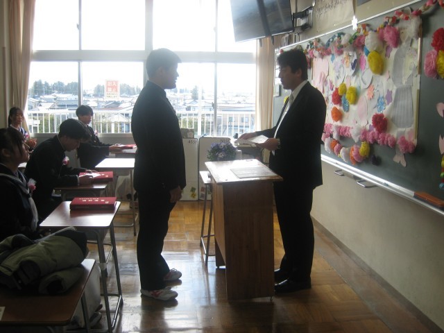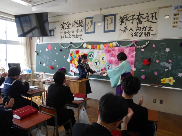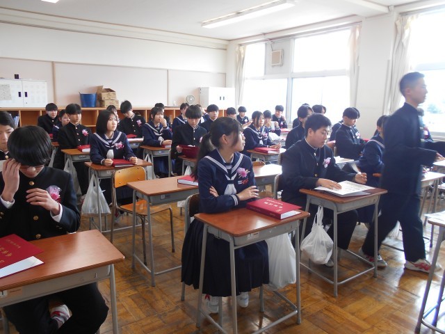 3年・学活 公開日 2026/03/12 更新日 2026/03/12 3学年 3月12日(木) 11:00 卒業式後の最後の学活です。担任の先生から、改めて一人一人に卒業証書が手渡されました。生徒からも担任の先生へ卒業証書を贈ったり、クラスのみんなで合唱したりと、名残惜しくも楽しいひと時を過ごしました。 +7