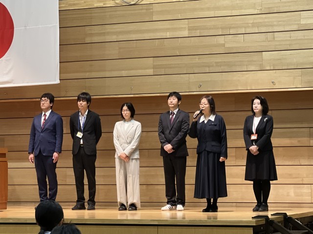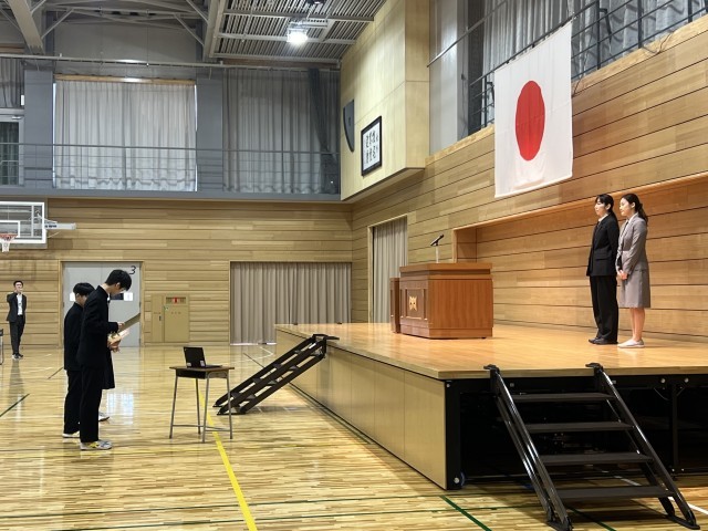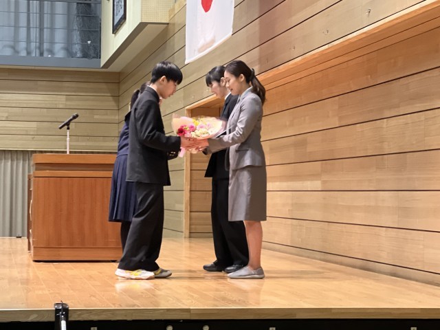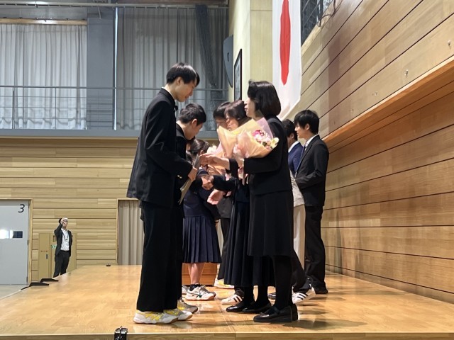 離任式では、14名、退任式では2名の教員が山室中学校での思いを話され、生徒から花束が贈呈されました。