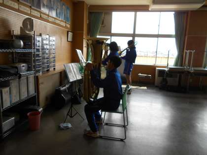 まずはパート練習で、それぞれの音色を確かめています。「ふるさと」の美しいメロディーが校舎内に響きます。