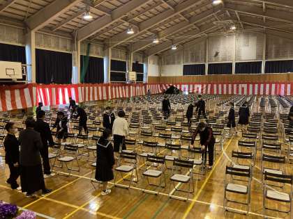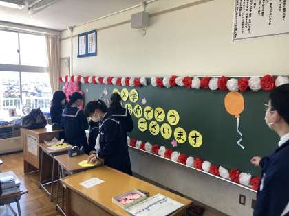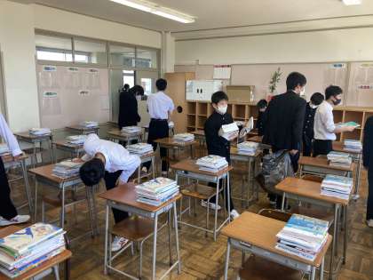 明日の新入生入学に向けて、2年生が教科書類を準備してくれました。教室のお祝い掲示で、教室環境もバッチリです。また、体育館は3年生が式場準備をしてくれました。