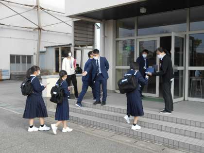 1年生初登校の朝です。ピカピカの自転車と、ピカピカの制服に身を包み、笑顔で登校です。玄関では手指消毒、体温チェックカードを見せて入ります。