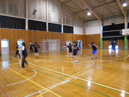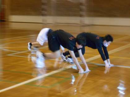 体育館では男女ハンドボール部が活動中です。部活動が始まって30分経ちますが・・・まだ筋トレ中です。女子はスクワットやフットワーク、男子はかけ声をかけながら雑巾がけでトレーニングです。