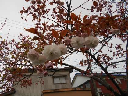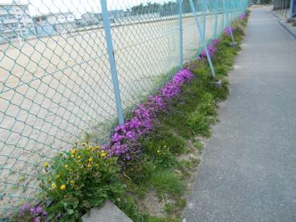テニスコートの側にはきれいなピンク色の芝桜が満開を迎えています。自転車の八重桜も強風に耐えながら咲き誇っています。