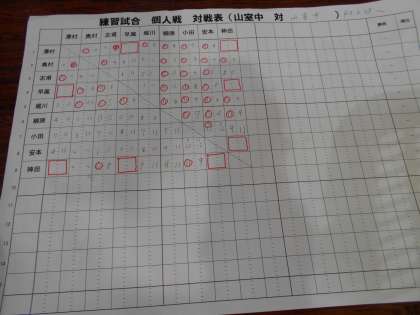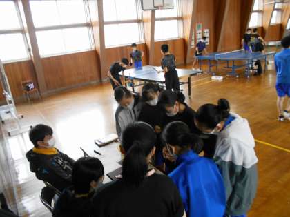 第2体育館では、男女卓球部が活動中です。顧問の先生のところに集合したかと思うと・・試合結果を用紙に記入しています!1ゲーム1ゲーム真剣に取り組んでいます。