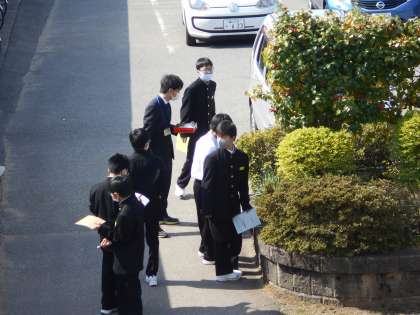 生徒はぽかぽか陽気の中、春の花見付けに外に出ています。「たんぽぽだ!」嬉しそうな声が聞こえます。
