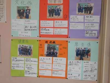 工夫がいっぱい1年教室 その2 公開日 2021/04/22 更新日 2021/04/22 山室中学校のページ 4月22日(木) 【1−4】各班の紹介が写真付きで載っています。 【1−5】各月のお誕生日の友達が紹介されています。 【1−6】これまでの学級のあゆみが写真で分かります。