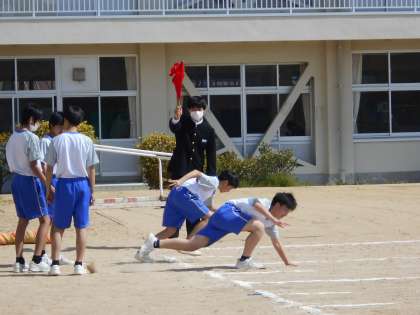 【2−5、6体育】青空の下、50m走です。自己記録を更新することはできましたか?