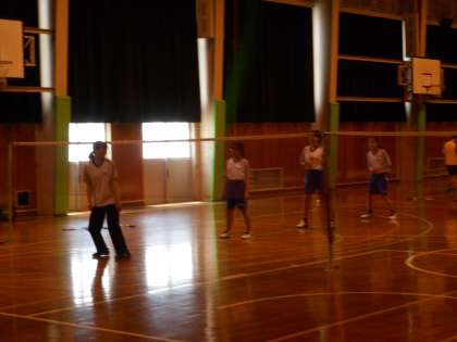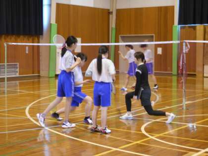 女子バドミントン部は、フットワークの確認をしています。2年生同士で教え合いながら何度もステップを練習します。