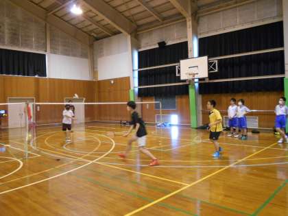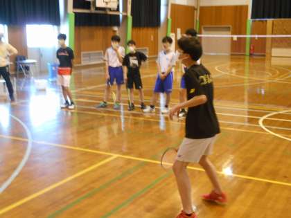 男子バドミントン部は、3人対2人でシャトルを出してもらい、前後左右色々なシャトルに反応できるようにするなど、練習方法を工夫しています。周りで見学している部員に、先輩が解説しながら教えます。
