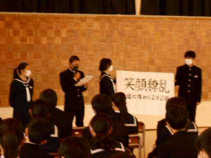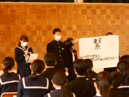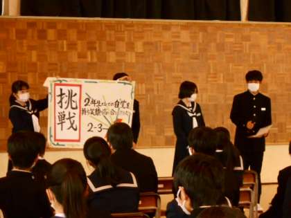 お披露目!2年生学級・学年目標 その1 公開日 2021/04/24 更新日 2021/04/24 山室中学校のページ 4月24日(土) 2年生は昨日までに各クラス、話し合いを重ね学年、学級目標が決まりました。学年集会にてお披露目したときの様子です。各クラスの代表が、学級目標に込められた思いを発表しました。1年間、学級・学年目標の達成に向けて力を合わせていきましょう! (写真上:1組 中:2組 下:3組)