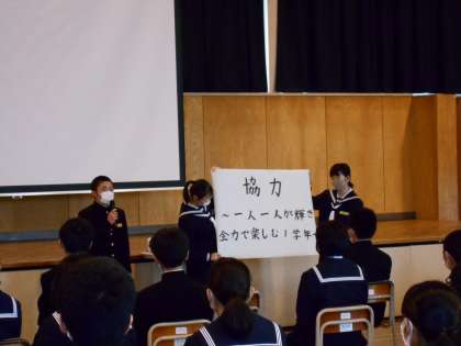 先週、学年集会にて、1学年の学級代表の紹介をしました。また、「協力 〜 一人一人が輝き、全力で楽しむ1学年 〜」という1学年目標がお披露目しました。1学年全員で協力して、諸活動に取り組んで行きます。