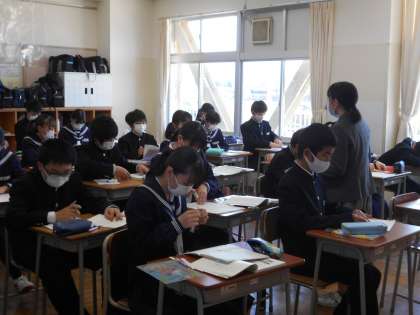 授業風景〜2年4組〜 公開日 2021/04/26 更新日 2021/04/26 山室中学校のページ 4月26日(月) 国語の「アイスプラネット」の学習です。今日は「第4場面を丁寧に読んでぼくの心情をとらえよう」という学習課題です。まずは一人でワークシートの問1〜4にチャレンジです。「どこに書いてあるんだー!?」必死なつぶやきが聞こえます。