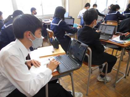 英語では、クロームブックを使ってパラリンピックの有名選手について調べています。さあ、どうやって選手について英語で紹介するのか・・・友達同士で教え合う姿も見られます。先生が表現方法についていくつかのヒントを示すと、生徒も英文を書き始めました。