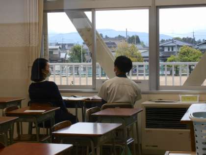 放課後の教室をのぞいてみると、3年生は担任の先生と机を並べて教育相談中です。1年生教室では、教育相談を終えた先生が机の整頓や教室の片付け等をしながら、明後日生徒を迎える準備をしています。