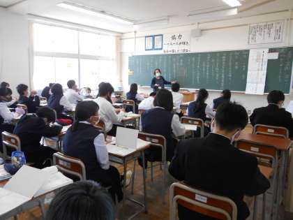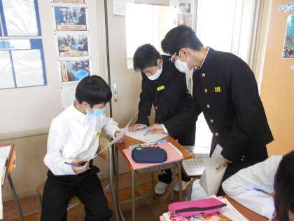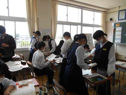 1年 授業風景 公開日 2021/05/24 更新日 2021/05/24 2学年 5月23日(月) 1年生は、校外学習に関わる学習も一段落し、授業に集中モードです。 【1年2組:国語】 文章を文節に分ける文法の学習を行っています。文章を拡大して、実施に文節に区切る練習をしています。(写真:上) 【1年6組:英語】 会話文を26秒内に終わらせるペア学習や、プリントを共に行う学び合い学習を行っています。(写真:中、下)