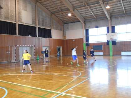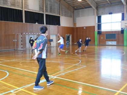 体育館では女子ハンドボール部が練習しています。ジグザグに後ろ向きや横向きで走るフットワークを念入りに行っています。顧問の宍戸先生が見守ります。